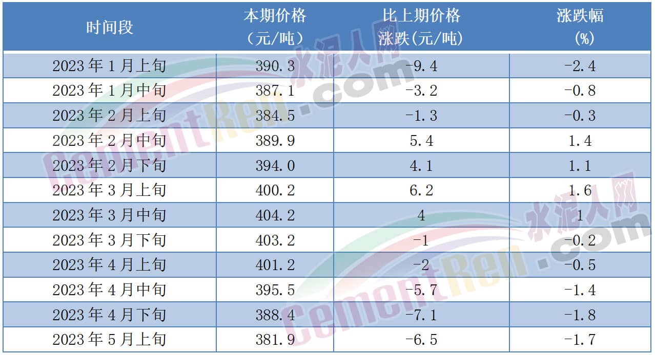 國家統(tǒng)計局最新發(fā)布的全國流通領(lǐng)域9大類50種重要生產(chǎn)資料市場價格顯示,2023年5月上旬與4月下旬相比,8種產(chǎn)品價格上漲,42種下降。其中,普通硅酸鹽水泥(P.O 42.5散裝)價格為381.9元/噸,較4月下旬下跌6.5元/噸,跌幅1.7%,為今年初至今的最低點了。