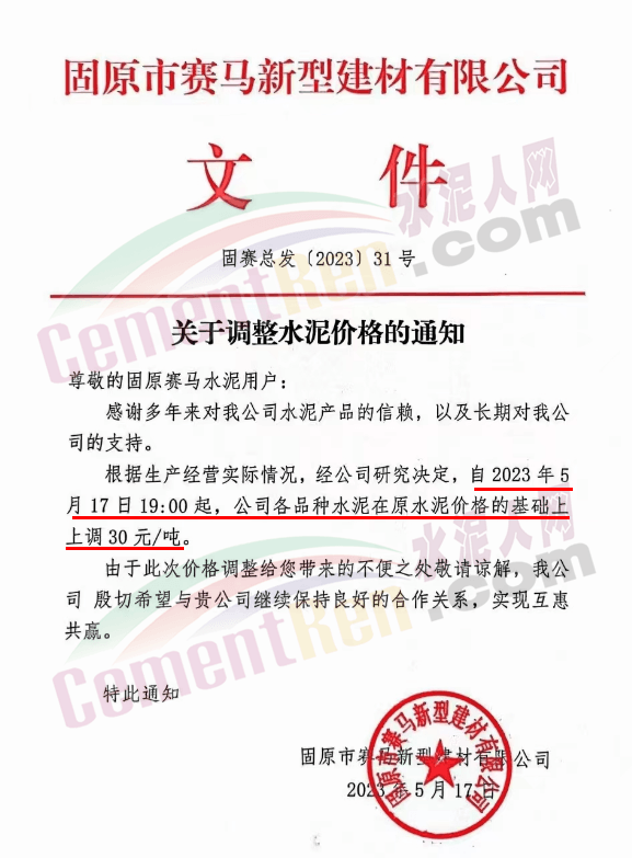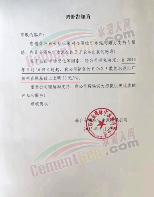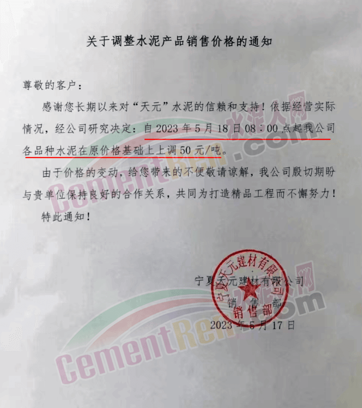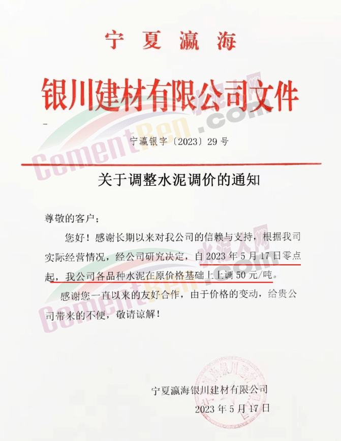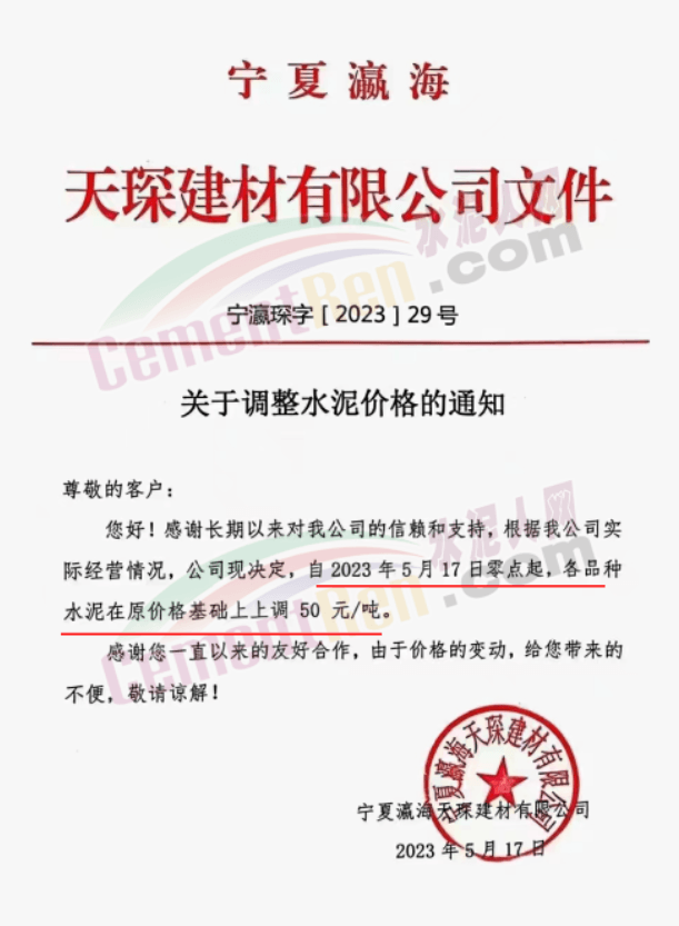 寧夏瀛海天琛建材有限公司通知,根據(jù)公司實(shí)際經(jīng)營情況,現(xiàn)決定,自2023年5月17日零點(diǎn)起,各品種水泥在原價(jià)格基礎(chǔ)上上調(diào)50元/噸。