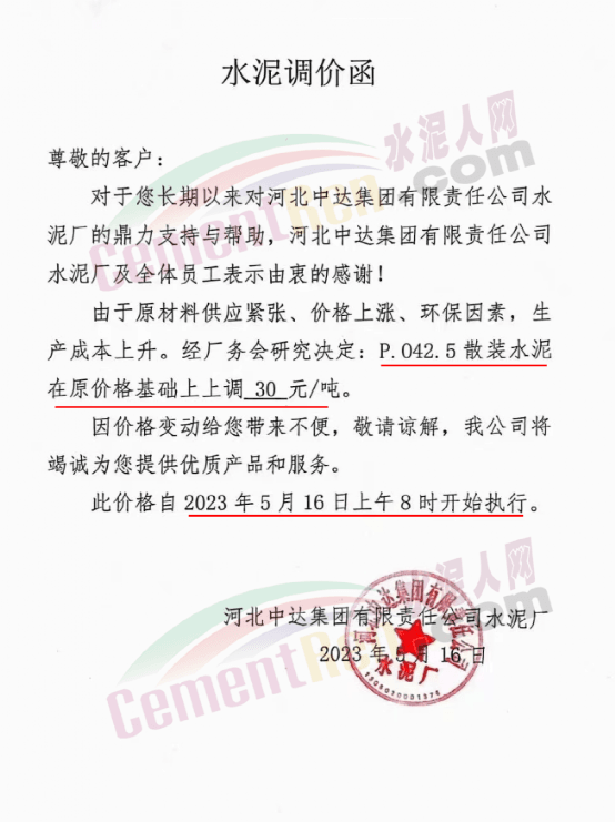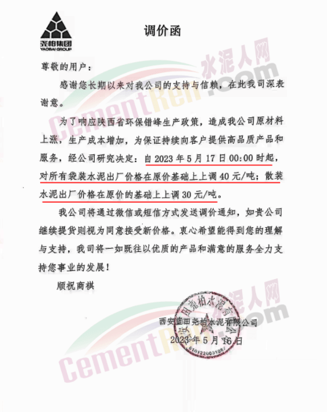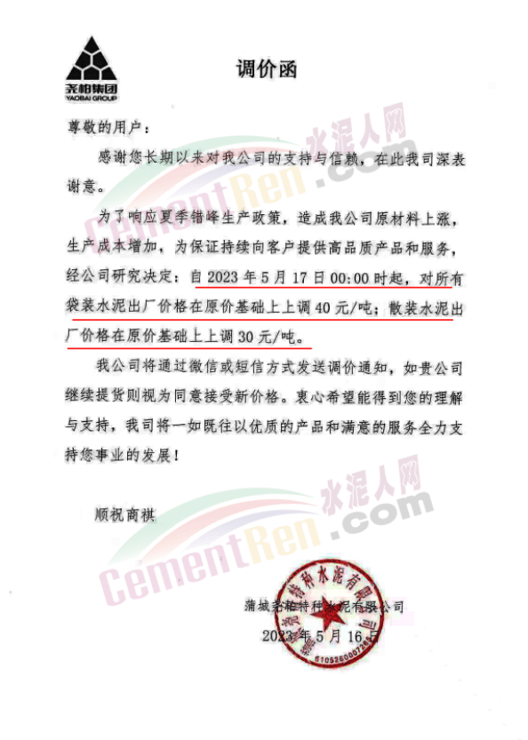 同日,蒲城堯柏特種水泥有限公司通知,為了響應(yīng)夏季錯(cuò)峰生產(chǎn)政策,造成公司原材料上漲,生產(chǎn)成本增加,為保證持續(xù)向客戶提供高品質(zhì)產(chǎn)品和服務(wù)。經(jīng)公司研究決定:自5月17日0時(shí)起,對所有袋裝水泥出廠價(jià)格在原價(jià)基礎(chǔ)上上調(diào)40元/噸;散裝水泥出廠價(jià)格在原價(jià)基礎(chǔ)上上調(diào)30元/噸。