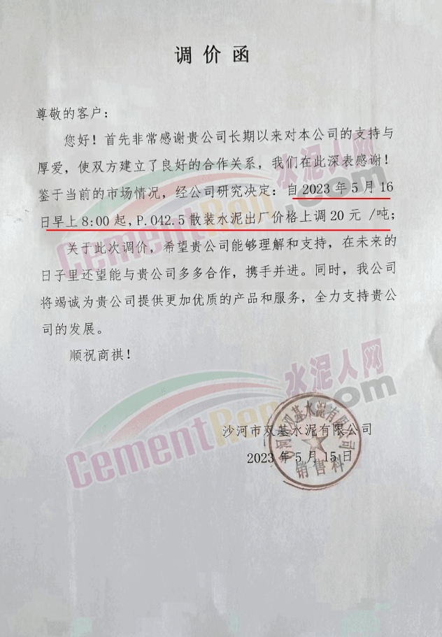 沙河雙基水泥有限公司通知,自5月16日早8時(shí)起,P.O42.5散裝水泥出廠價(jià)格上調(diào)20元/噸。