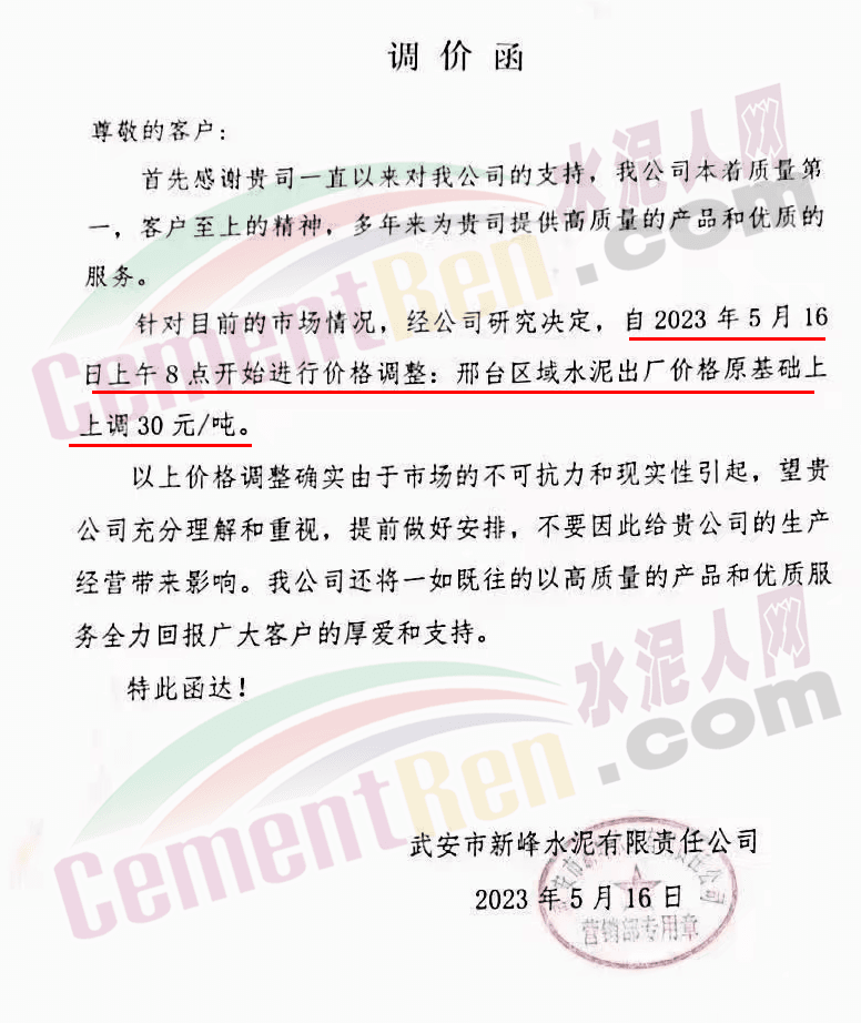 武安市新峰水泥有限責(zé)任公司通知,自5月16日上午8時(shí)起邢臺區(qū)域水泥出廠價(jià)格上調(diào)30元/噸。