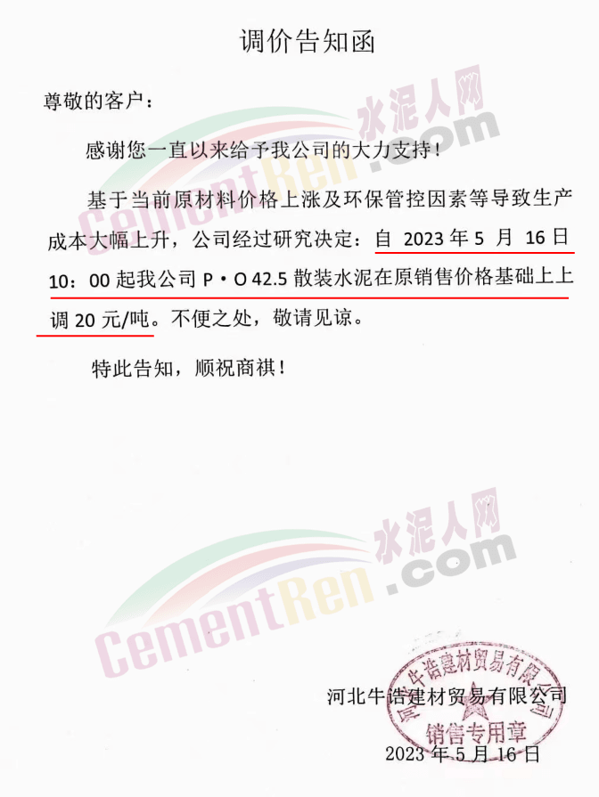 河北牛誥建材貿(mào)易有限公司通知,基于當(dāng)前原材料價(jià)格上漲及環(huán)保管控因素等導(dǎo)致生產(chǎn)成本大幅上升,公司經(jīng)過研究決定:自5月16日10時(shí)起,P.O42.5散裝水泥上調(diào)20元/噸。