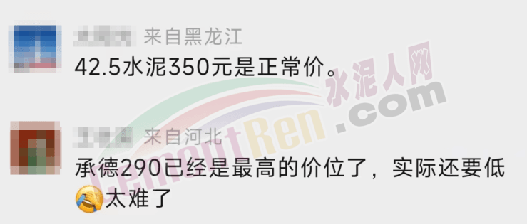 來自黑龍江的網(wǎng)友表示,42.5水泥350元/噸是正常價(jià);來自河北的網(wǎng)友表示,承德P.O42.5水泥290元/噸是最高的價(jià)位了,實(shí)際還要低。