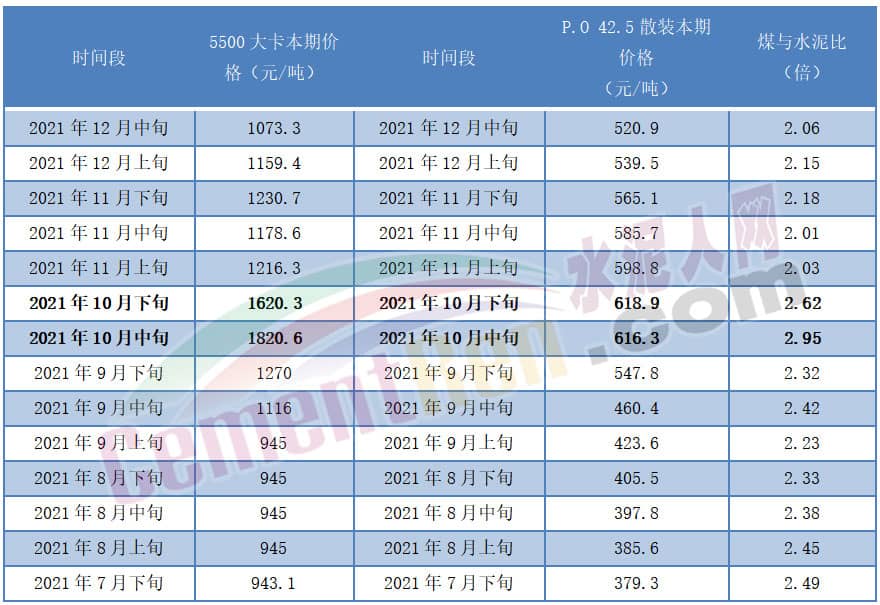國家統(tǒng)計(jì)局公布的數(shù)據(jù)顯示,2021年10月中下旬5500大卡煤炭報(bào)價1600元/噸以上的時候,水泥價格也漲至當(dāng)年最高點(diǎn)610元/噸以上。且自7月下旬到12月中旬,煤價一直是水泥價格的兩倍多。