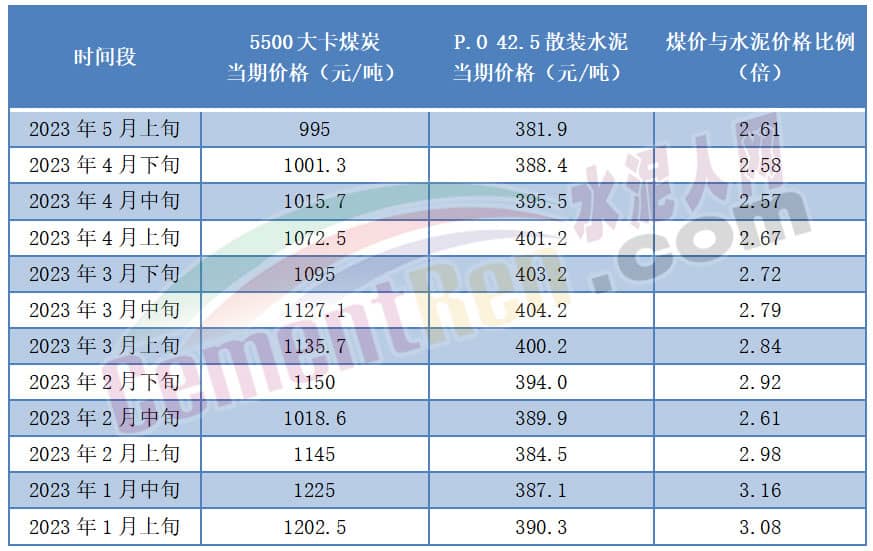 今年1月上旬~5月上旬,5500大卡煤炭與P.O42.5散裝水泥價格比例也多在2倍多。也就是說煤價調(diào)整的同時水泥價格也在調(diào)整,其比例一直較穩(wěn)定。今年煤價微降,水泥價格跌至近五年新低,水泥跌價與煤炭跌價出現(xiàn)脫鉤跡象,水泥下跌幅度明顯比煤炭幅度要大。