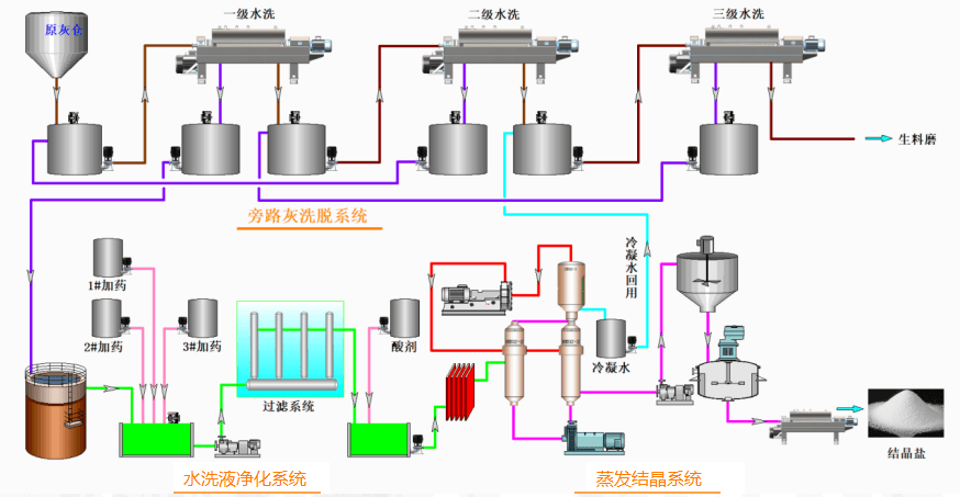 水洗液送入水洗液凈化單元中經(jīng)軟化、降懸浮物、中和等物理化學(xué)處理后,進(jìn)入蒸發(fā)結(jié)晶單元。蒸發(fā)結(jié)晶產(chǎn)出的結(jié)晶鹽作為產(chǎn)品外售,蒸發(fā)過(guò)程的冷凝水全部回用到旁路灰洗脫單元循環(huán)利用,零排放。