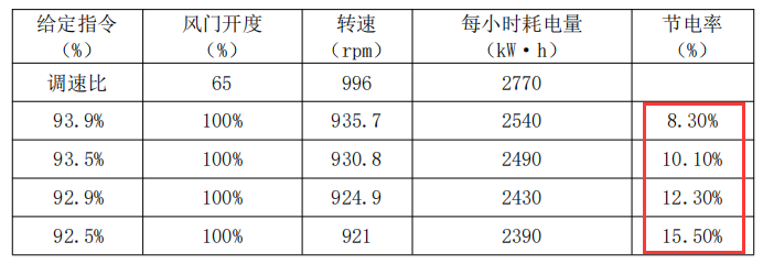 相較于工頻轉(zhuǎn)速,65度風(fēng)門開度節(jié)電率約為15.5%。