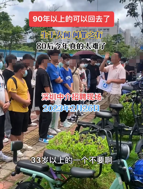 廣東深圳某中介招聘現(xiàn)場,負責人表示90年以前的(33歲以上)被拒絕,80后更是失去發(fā)言權,這也意味著,當?shù)卣泄て髽I(yè)一大半都有著這種要求,才會反饋到中介方面。