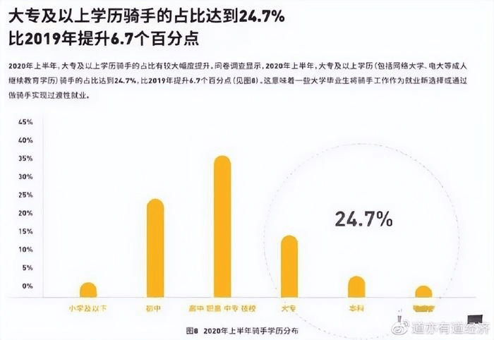 根據(jù)全國總工會發(fā)布的數(shù)據(jù),目前全國網(wǎng)約車駕駛員和快遞小哥等新就業(yè)形態(tài)勞動者約有8400萬人,約占全國職工的20%左右,并且素質(zhì)不低,大專以上學歷的騎手占比達到了25%,碩士以上的騎手就有7萬多人。而美團小哥和快遞員們的晝夜加班、馬不停蹄等季度“內(nèi)卷”的行為也絲毫沒有緩解。這也讓眾多畢業(yè)生擔心,學歷膨脹的時代,留給他們的退路究竟還有多少。