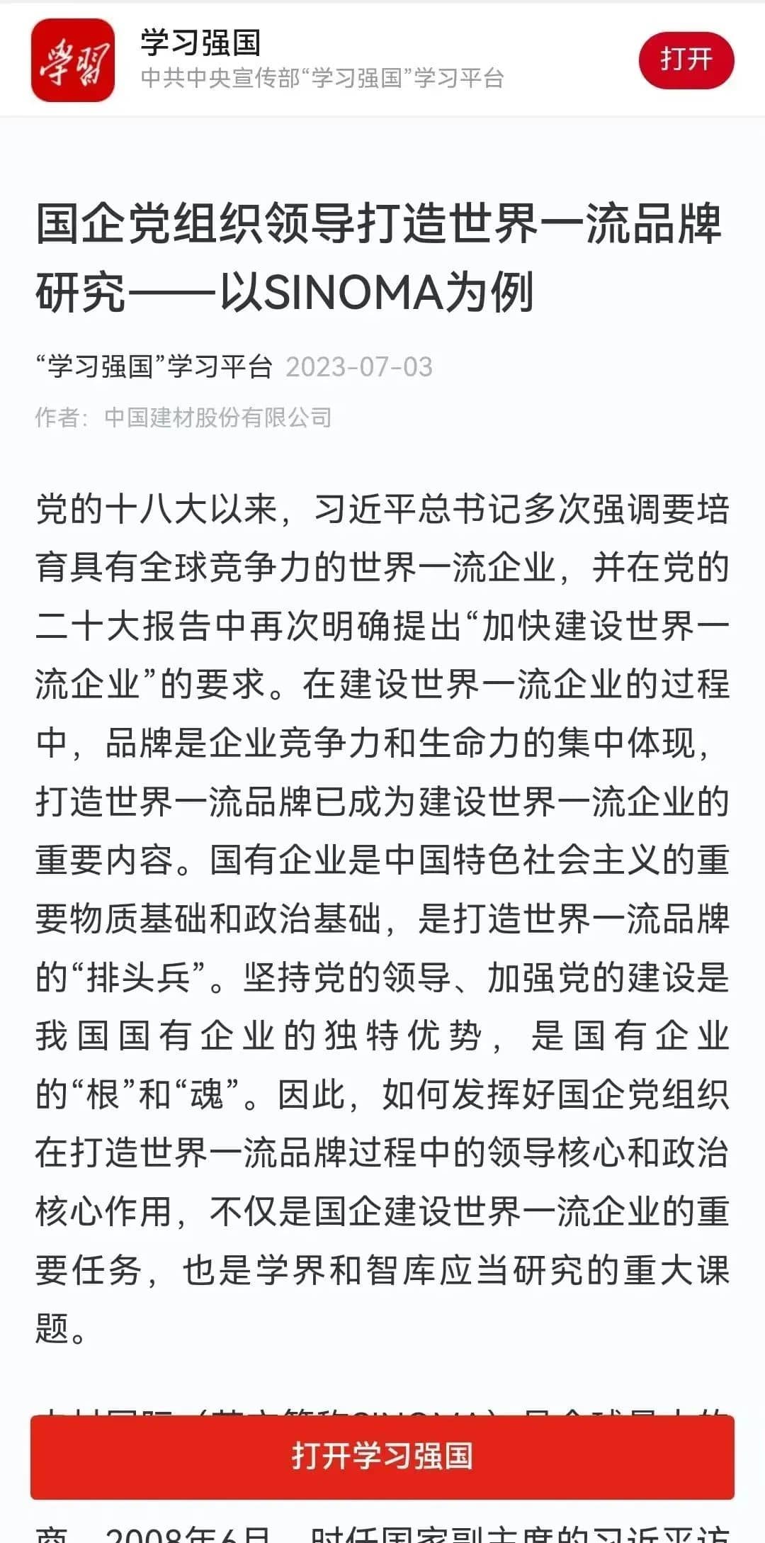 本文基于中材國(guó)際黨委在領(lǐng)導(dǎo)企業(yè)發(fā)展尤其走向世界的過(guò)程中成功打造和建設(shè)SINOMA品牌的實(shí)踐,深化研究國(guó)企黨組織領(lǐng)導(dǎo)打造世界一流品牌若干問(wèn)題,以期為國(guó)企黨建和改革提供管窺之見(jiàn)。