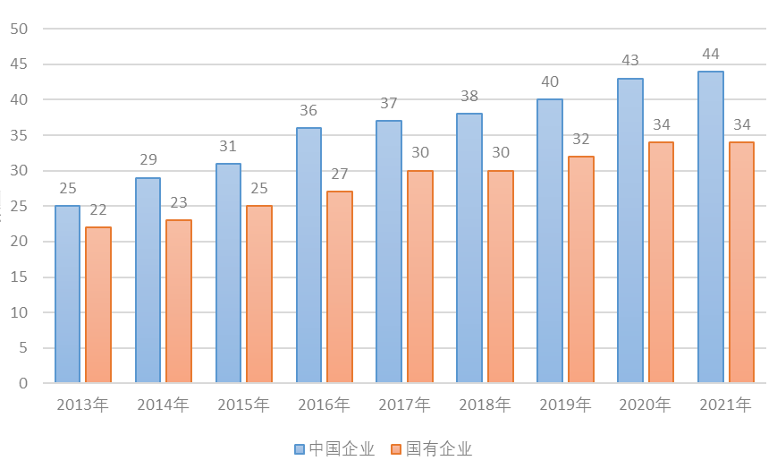 圖2 2013年—2021年中國(guó)企業(yè)、國(guó)有企業(yè)入圍《世界品牌500強(qiáng)》數(shù)量。資料來(lái)源:世界品牌實(shí)驗(yàn)室網(wǎng)站,http://www.worldbrandlab.com。