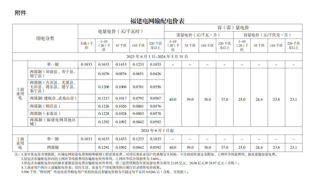 福建省發(fā)展和改革委員會發(fā)布《關(guān)于落實第三監(jiān)管周期輸配電價有關(guān)事項的通知》 。新的省級電網(wǎng)輸配電價自2023年6月1日起執(zhí)行,即全省工商業(yè)用戶6月份用電產(chǎn)生電費按最新電價政策執(zhí)行。此次電價調(diào)整對象為全省工商業(yè)用戶,除執(zhí)行居民生活和農(nóng)業(yè)生產(chǎn)用電價格以外的用電。