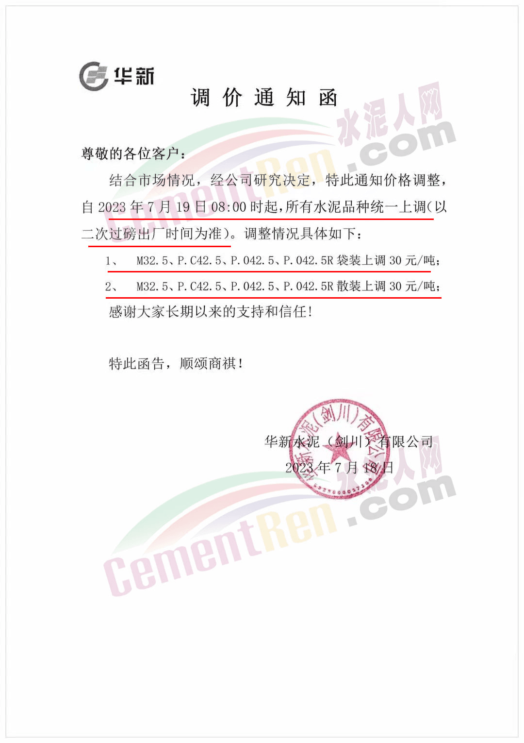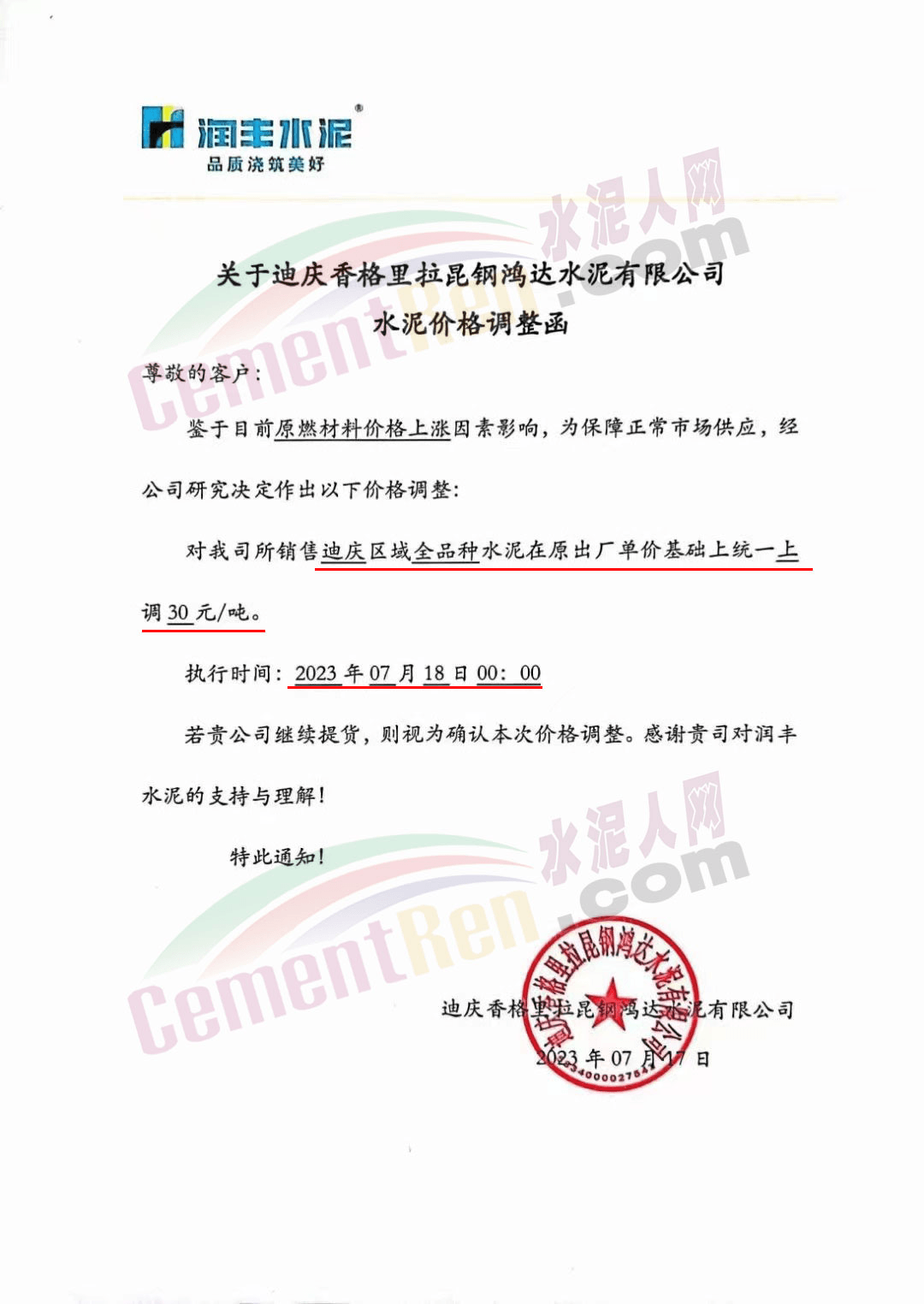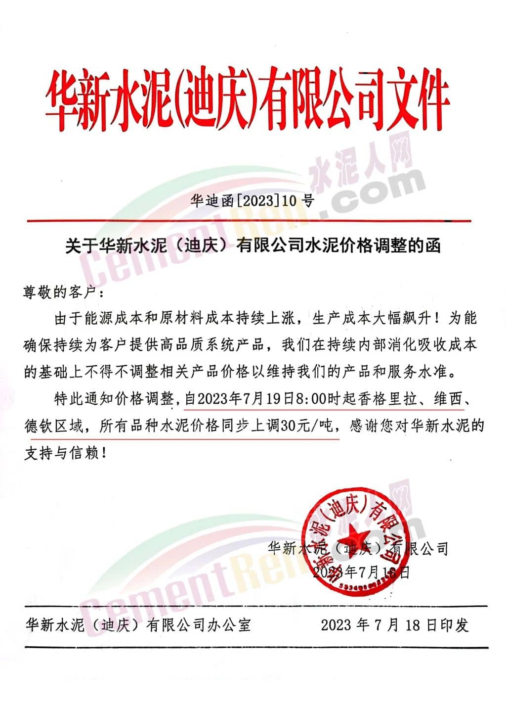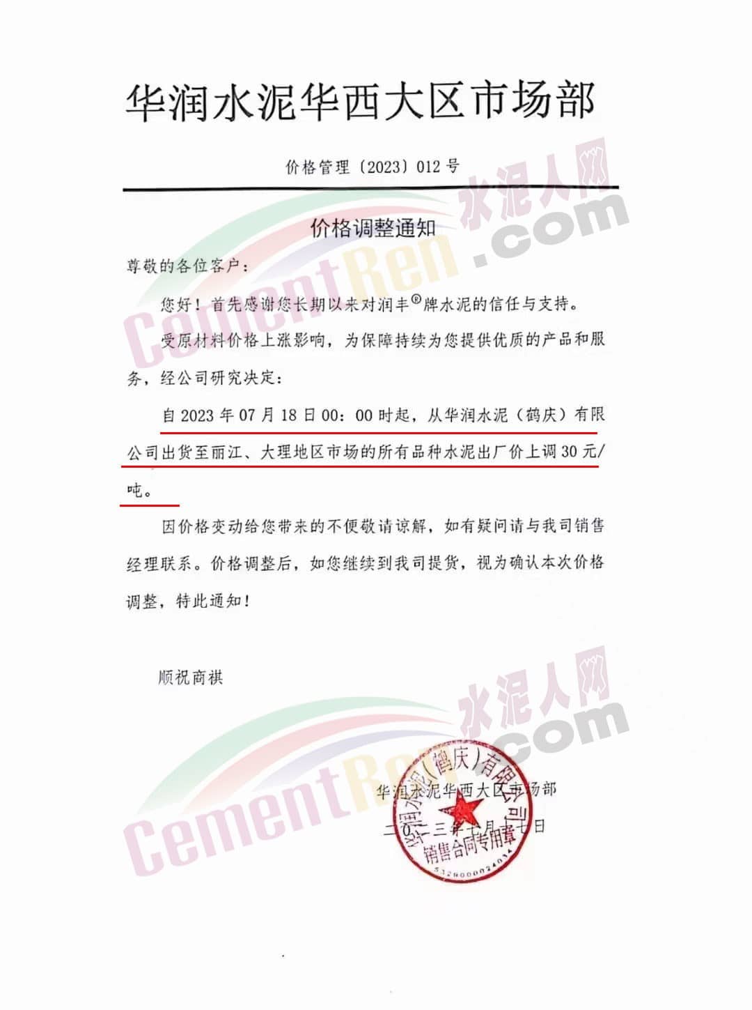 華潤水泥華西大區(qū)市場部通知受原材料價格上漲影響,為保障持續(xù)為客戶提供優(yōu)質(zhì)的產(chǎn)品和服務(wù),經(jīng)公司研究決定,自2023年7月18日0時起,從華潤水泥(鶴慶)有限公司出貨至麗江、大理地區(qū)市場的所有品種水泥出廠價上調(diào)30元/噸。