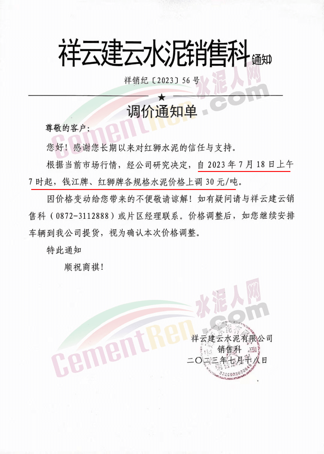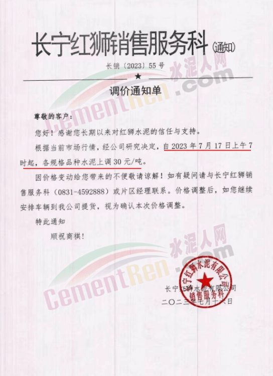 祥云建云水泥銷售科通知根據(jù)當前市場行情,經(jīng)公司研究決定,自2023年7月18日上午7時起,錢江牌、紅獅牌各規(guī)格水泥價格上調(diào)30元/噸。