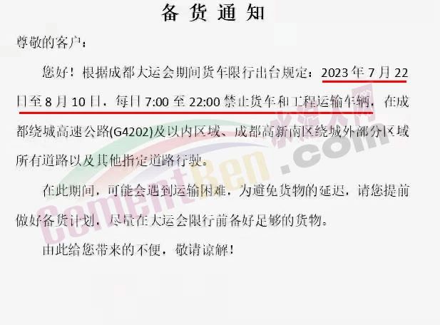 同期,四川成都及周邊地區(qū)企業(yè)接到備貨通知稱,根據(jù)成都大運會期間貨車限行出臺規(guī)定,2023年7月22日至8月10日,每日7時至22時禁止貨車和工程運輸車輛,在成都繞城高速公路(G4202)及以內(nèi)區(qū)域、成都高新南區(qū)繞城外部分區(qū)域所有道路以及其他指定道路行駛。