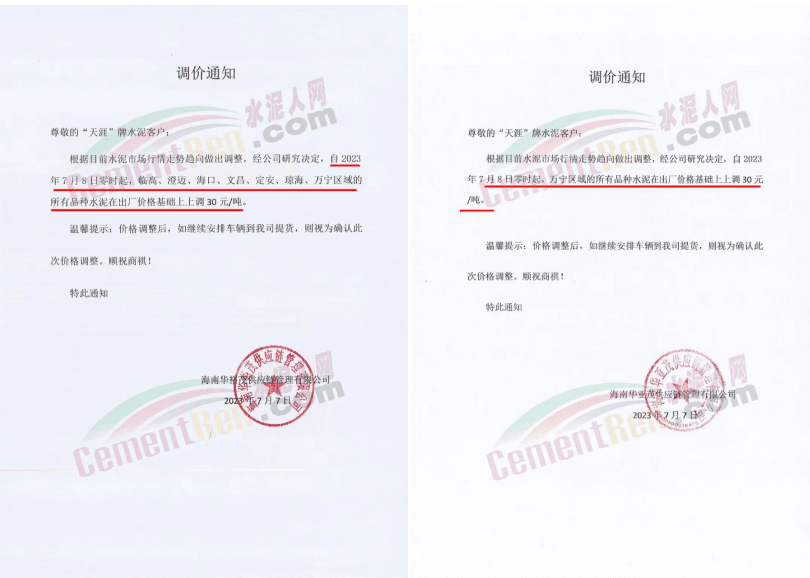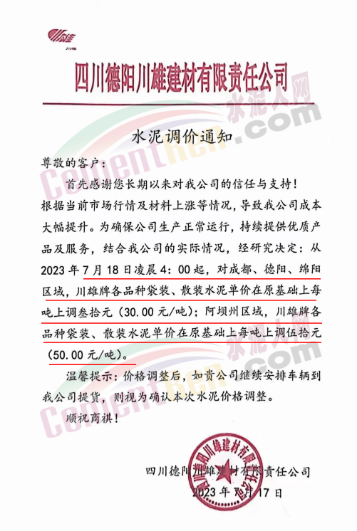 麗江古城西南水泥有限公司通知,因近期原燃材料漲價,經(jīng)公司研究決定,自2023年7月18日0時起,對所有區(qū)域的全品種水泥在原價格基礎(chǔ)上上調(diào)30元/噸。
