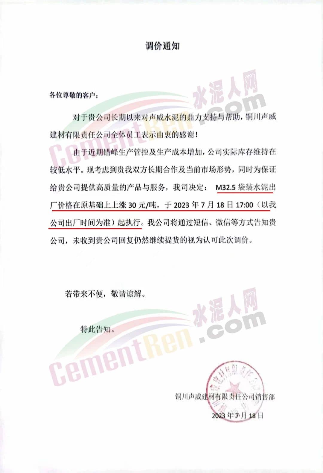 銅川聲威建材有限責任公司通知稱,由于近期錯峰生產(chǎn)管控及生產(chǎn)成本增加,公司實際庫存維持在較低水平。公司決定M32.5袋裝水泥出廠價格在原基礎(chǔ)上上漲30元/噸,于2023年7月18日17時起執(zhí)行。