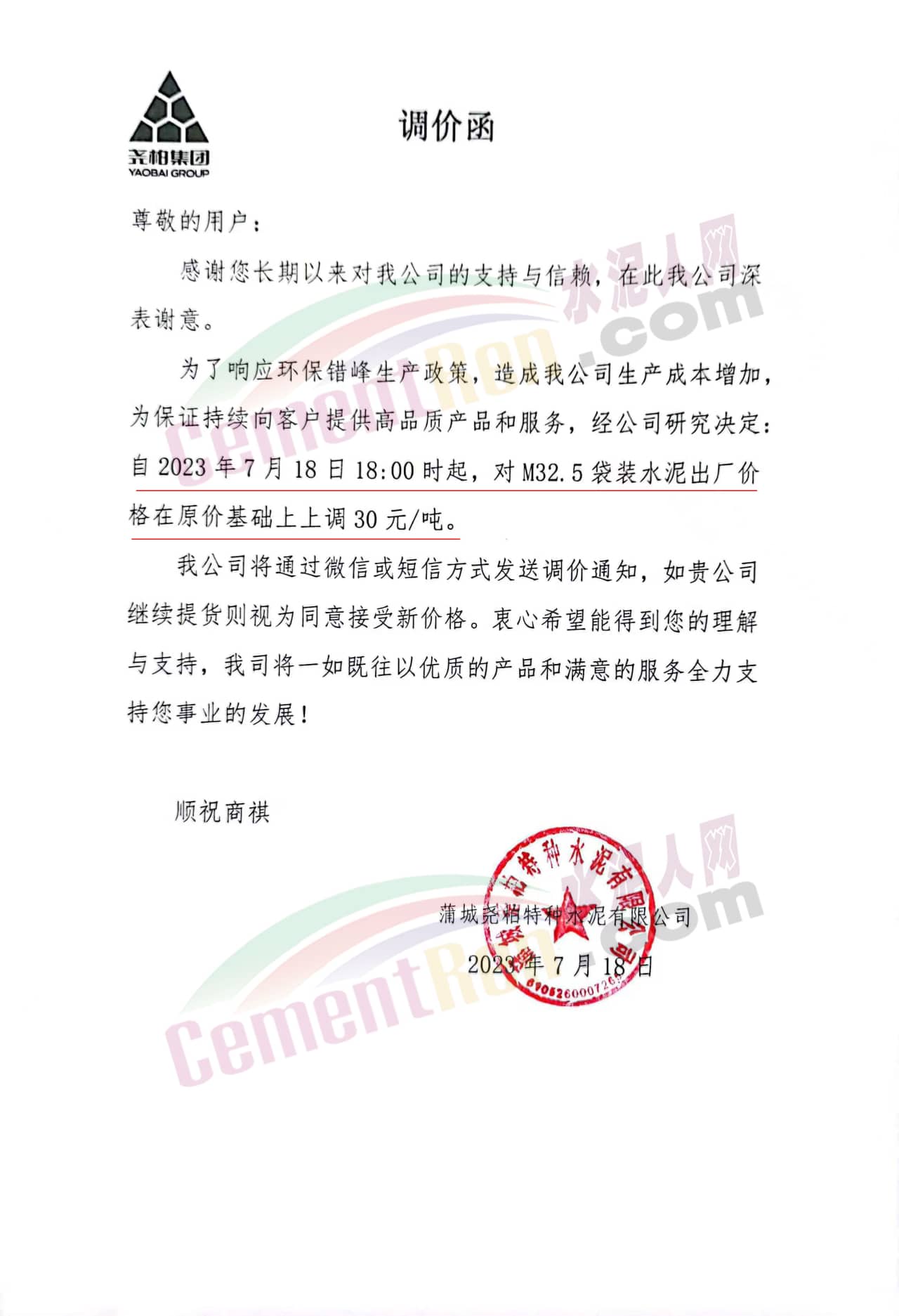 蒲城堯柏特種水泥有限公司通知,為了響應(yīng)環(huán)保錯峰生產(chǎn)政策,造成公司生產(chǎn)成本增加。為保證持續(xù)向客戶提供高品質(zhì)產(chǎn)品和服務(wù),經(jīng)公司研究決定,自2023年7月18日18時起,對M32.5袋裝水泥出廠價格在原價基礎(chǔ)上上調(diào)30元/噸。