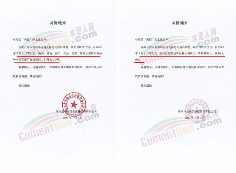 迪慶香格里拉昆鋼鴻達水泥有限公司通知鑒于目前原燃材料價格上漲因素影響,為保障正常市場供應(yīng),經(jīng)公司研究決定作出以下價格調(diào)整,對銷售迪慶區(qū)域全品種水泥在原出廠單價基礎(chǔ)上統(tǒng)一上調(diào)30元/噸,執(zhí)行時間2023年7月18日0時。