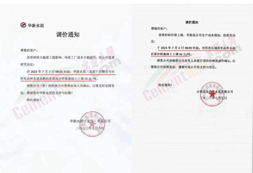 華新水泥(劍川)有限公司通知結(jié)合市場情況,經(jīng)公司研究決定,特此通知價格調(diào)整。自2023年7月19日8時起,所有水泥品種統(tǒng)一上調(diào)30元/噸。