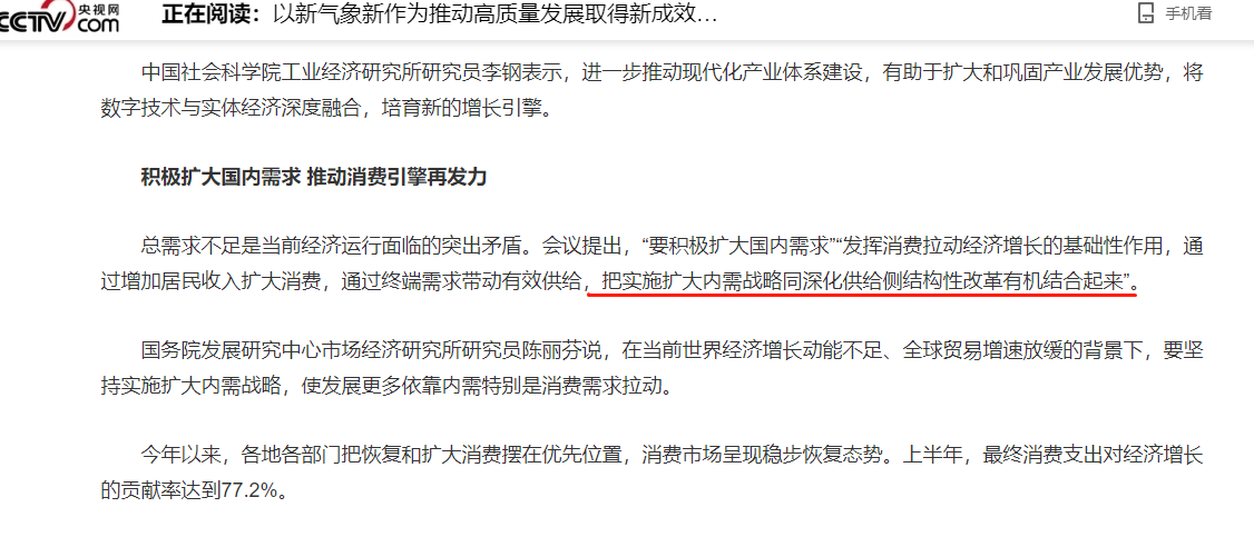 近日,國家下半年經(jīng)濟(jì)會(huì)議召開,針對(duì)國內(nèi)經(jīng)濟(jì)疲軟,給出救市方案,會(huì)議強(qiáng)調(diào),要積極擴(kuò)大國內(nèi)需求,發(fā)揮消費(fèi)拉動(dòng)經(jīng)濟(jì)增長的基礎(chǔ)性作用,通過增加居民收入擴(kuò)大消費(fèi),通過終端需求帶動(dòng)有效供給,把實(shí)施擴(kuò)大內(nèi)需戰(zhàn)略同深化供給側(cè)結(jié)構(gòu)性改革有機(jī)結(jié)合起來。