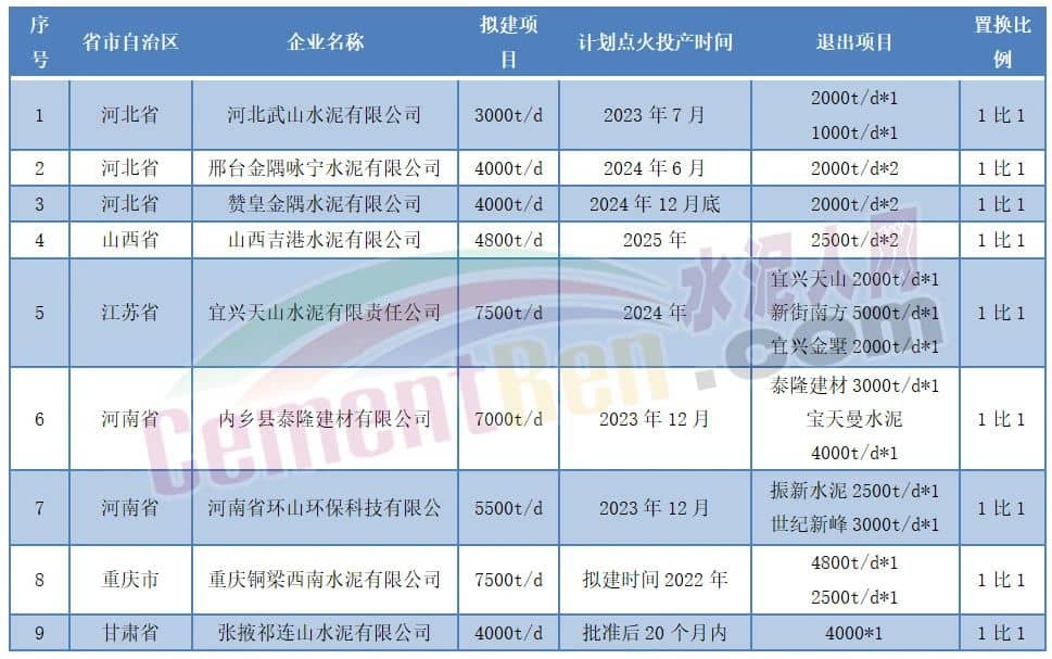 河北工信廳2022年公告的河北武山水泥有限公司3000t/d、邢臺金隅詠寧水泥有限公司4000t/d、贊皇金隅水泥有限公司4000t/d,3個新型干法水泥熟料技改項(xiàng)目,置換比例均為1:1,擬建產(chǎn)能合計(jì)330萬噸/年。