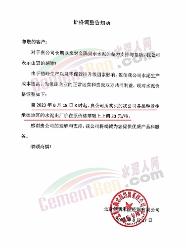 北京金隅水泥經(jīng)貿(mào)有限公司通知稱,由于錯(cuò)峰生產(chǎn)以及環(huán)保管控升級(jí)因素影響,致使公司水泥生產(chǎn)成本提高。為保證企業(yè)的正常運(yùn)營,自2023年8月18日8時(shí)公司各品種發(fā)往承德地區(qū)的水泥出廠價(jià)在原價(jià)格基礎(chǔ)上上調(diào)30元/噸。
