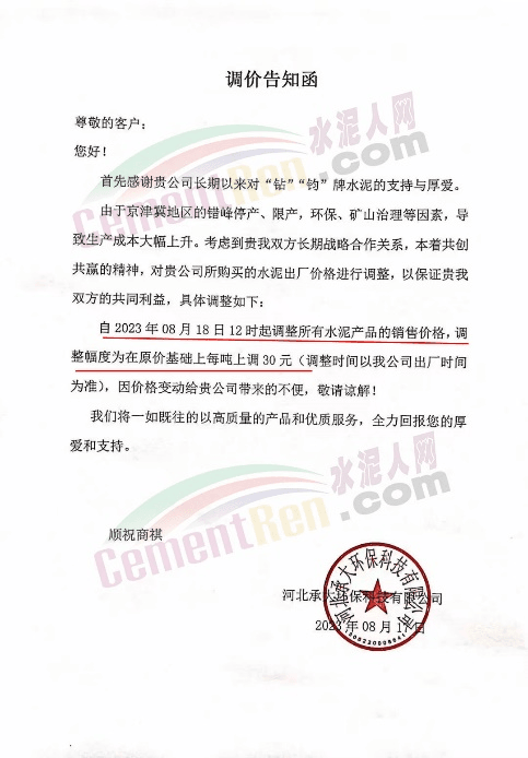 河北承大環(huán)??萍加邢薰就ㄖ?,由于京津冀地區(qū)的錯(cuò)峰停產(chǎn)、限產(chǎn),環(huán)保、礦山治理等因素,導(dǎo)致生產(chǎn)成本大幅上升。自2023年8月18日12時(shí)起調(diào)整所有水泥產(chǎn)品的銷售價(jià)格,調(diào)整幅度為在原價(jià)基礎(chǔ)上每噸上調(diào)30元。