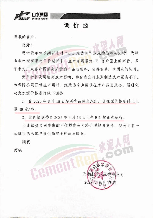 天津山水水泥有限公司通知稱,受原材料及運(yùn)輸高成本影響,導(dǎo)致公司水泥制造成本居高不下。為保障公司正常生產(chǎn)運(yùn)行,繼續(xù)為客戶提供優(yōu)質(zhì)產(chǎn)品及服務(wù),經(jīng)研究決定自2023年8月18日起所有品種水泥出廠價(jià)在原價(jià)格基礎(chǔ)上上調(diào)30元/噸。