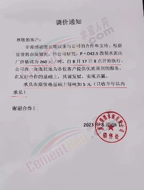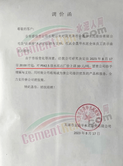 天津市金晟華水泥股份有限公司通知稱,由于市場(chǎng)變化等因素,經(jīng)公司研究決定自2023年8月17日20:00時(shí)起,對(duì)PO42.5級(jí)水泥出廠價(jià)上調(diào)30元/噸。