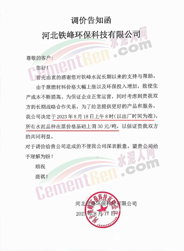 河北鐵峰環(huán)??萍加邢薰就ㄖQ,由于原燃材料價(jià)格大幅上漲以及環(huán)保投入增加,致使生產(chǎn)成本不斷提高。為保證企業(yè)正常運(yùn)營,決定于2023年8月18日上午8時(shí),所有水泥品種在原價(jià)格基礎(chǔ)上調(diào)30元/噸。