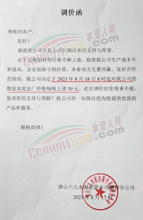 灤縣磐石水泥有限公司通知稱,由于近期企業(yè)環(huán)保投入以及煤炭等原燃材料不斷增加,致使水泥成本不斷提高。根據(jù)成本增長和市場(chǎng)情況,自2023年8月18日8時(shí)起水泥產(chǎn)品出廠價(jià)格在原價(jià)格基礎(chǔ)上每噸上調(diào)30元。