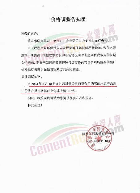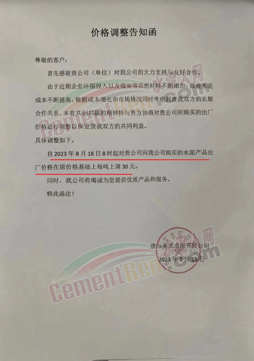 唐山圣龍水泥有限公司通知稱,由于近期企業(yè)環(huán)保投入以及煤炭等原燃材料不斷增加,致使水泥成本不斷提高。根據(jù)成本增長和市場(chǎng)情況,自2023年8月18日8時(shí)起,水泥出廠價(jià)格在原價(jià)格基礎(chǔ)上每噸上調(diào)30元。