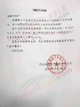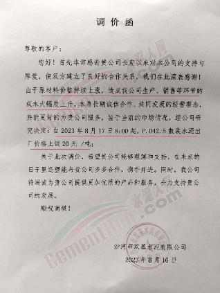 沙河市雙基水泥有限公司通知,由于原材料價(jià)格持續(xù)上漲,造成公司生產(chǎn)、銷售等環(huán)節(jié)的成本大幅度上升,本著長期誠信合作、共同發(fā)展的經(jīng)營理念并能更好的為貴公司服務(wù),鑒于當(dāng)前的市場(chǎng)情況,經(jīng)公司研究決定,自2023年8月17日8時(shí)起,P.O42.5散裝水泥出廠價(jià)格上調(diào)20元/噸。