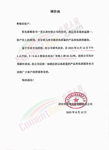 武安市新峰水泥有限責(zé)任公司通知稱,自2023年8月12日下午3點(diǎn)開始,P.O42.5散裝水泥出廠價(jià)格上調(diào)30元/噸。