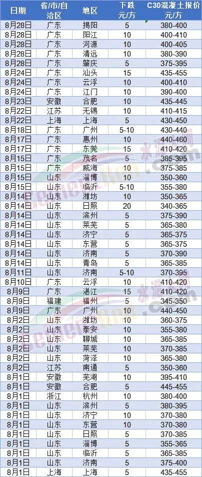 同期,下游商混企業(yè)被迫跟進(jìn)下調(diào)報價,進(jìn)入8月份以來廣東、山東、安徽、江蘇、浙江等多個區(qū)域商品混凝土報價下跌。其中山東區(qū)域下跌2-3輪,累計下跌10-25元/方;廣東多地混凝土價格下跌5-20元/方;其他區(qū)域多為5-15元/方不等的下跌。