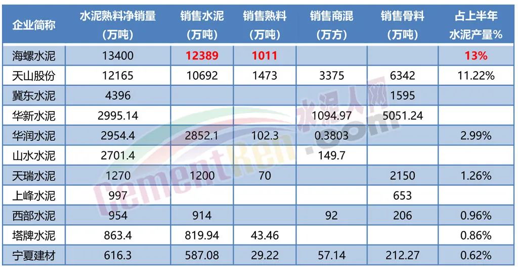 海螺水泥近期表示,去年下半年之后海螺的份額有所回升,基本維持在13%左右。而從近期公布財報的12家上市企業(yè)產(chǎn)品銷量數(shù)據(jù)可見,僅產(chǎn)能排名前兩位的海螺水泥和天山股份水泥和熟料合計銷量過億噸。排名銷量第三位的冀東水泥銷售僅是海螺水泥的三分之一。其中,天山股份水泥銷量10692萬噸,占比11.22%;按照海螺水泥公布的上半年市場份額維持在13%左右推算,其水泥銷量或達(dá)12389萬噸,熟料銷量達(dá)1011萬噸。