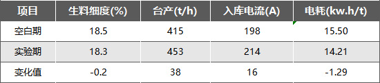 空白期與試驗(yàn)期生料磨主要參數(shù)對(duì)比情況如上表所示,在系統(tǒng)操作參數(shù)、質(zhì)量控制指標(biāo)不做較大調(diào)整的情況下,使用生料助磨劑后,生料磨入庫(kù)斗提電流上升16A,臺(tái)時(shí)產(chǎn)量平均上升38t/h,噸生料電耗下降1.29 kwh/t,提產(chǎn)降耗效果達(dá)到預(yù)期。