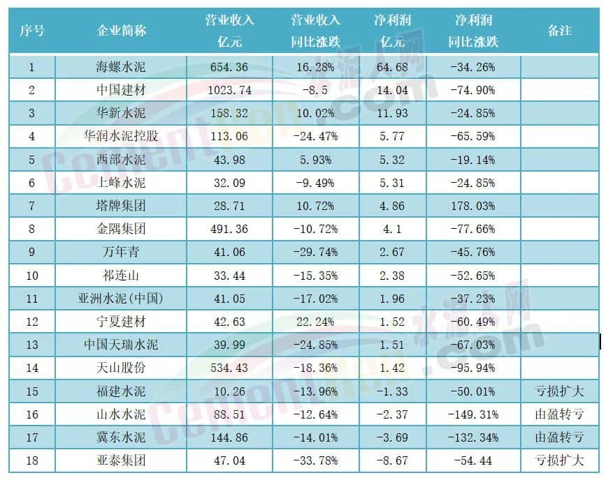 此外,還有不少企業(yè)出現(xiàn)虧損。冀東水泥營(yíng)收實(shí)現(xiàn)144.86億元,同比下降14.01%;歸母凈利潤(rùn)-3.69億元,同比下降132.34%。