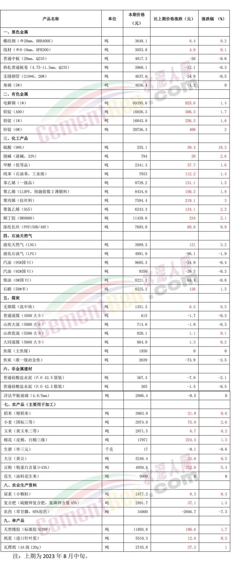 2023年8月下旬流通領(lǐng)域重要生產(chǎn)資料市場價格變動情況