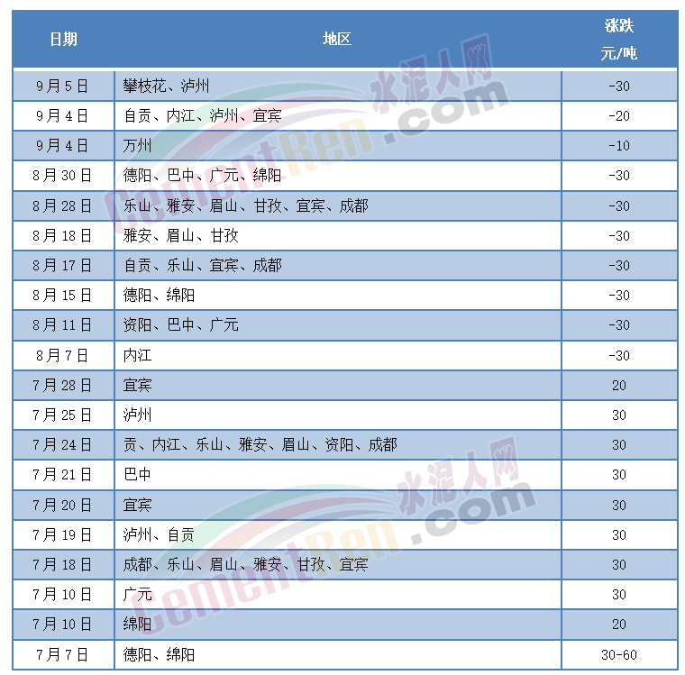 7月份,四川宜賓、綿陽等多個區(qū)域主要品牌水泥企業(yè)連續(xù)兩至三次通知上調(diào)水泥價格,累計上調(diào)50~90元/噸;德陽、瀘州、自貢、樂山、眉山、雅安、成都等區(qū)域主要品牌企業(yè)連續(xù)兩次通知上調(diào)水泥價格,累計上調(diào)60元/噸。