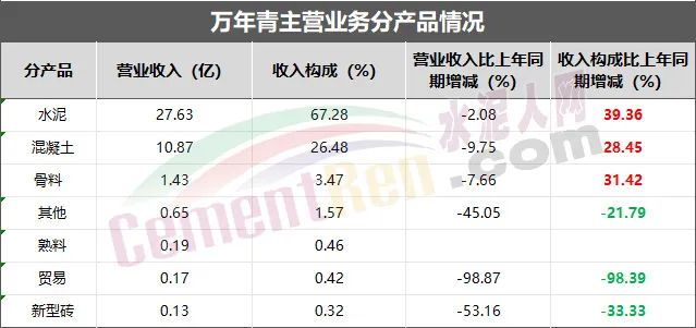 今年上半年,萬年青所有產(chǎn)品業(yè)務(wù)版塊營業(yè)收入同比去年均有所減少,但水泥、混凝土、骨料業(yè)務(wù)營業(yè)收入占比同比去年均有所增加。水泥營收占比同比增加39.36%,混凝土營收占比同比增加28.45%,骨料營收占比同比增加31.42%。