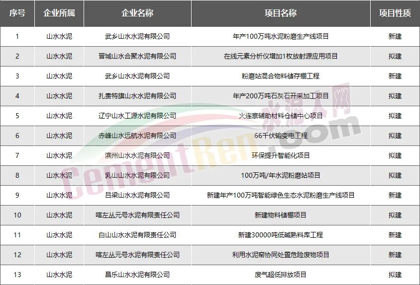 山水水泥:新建擬建項目共13個