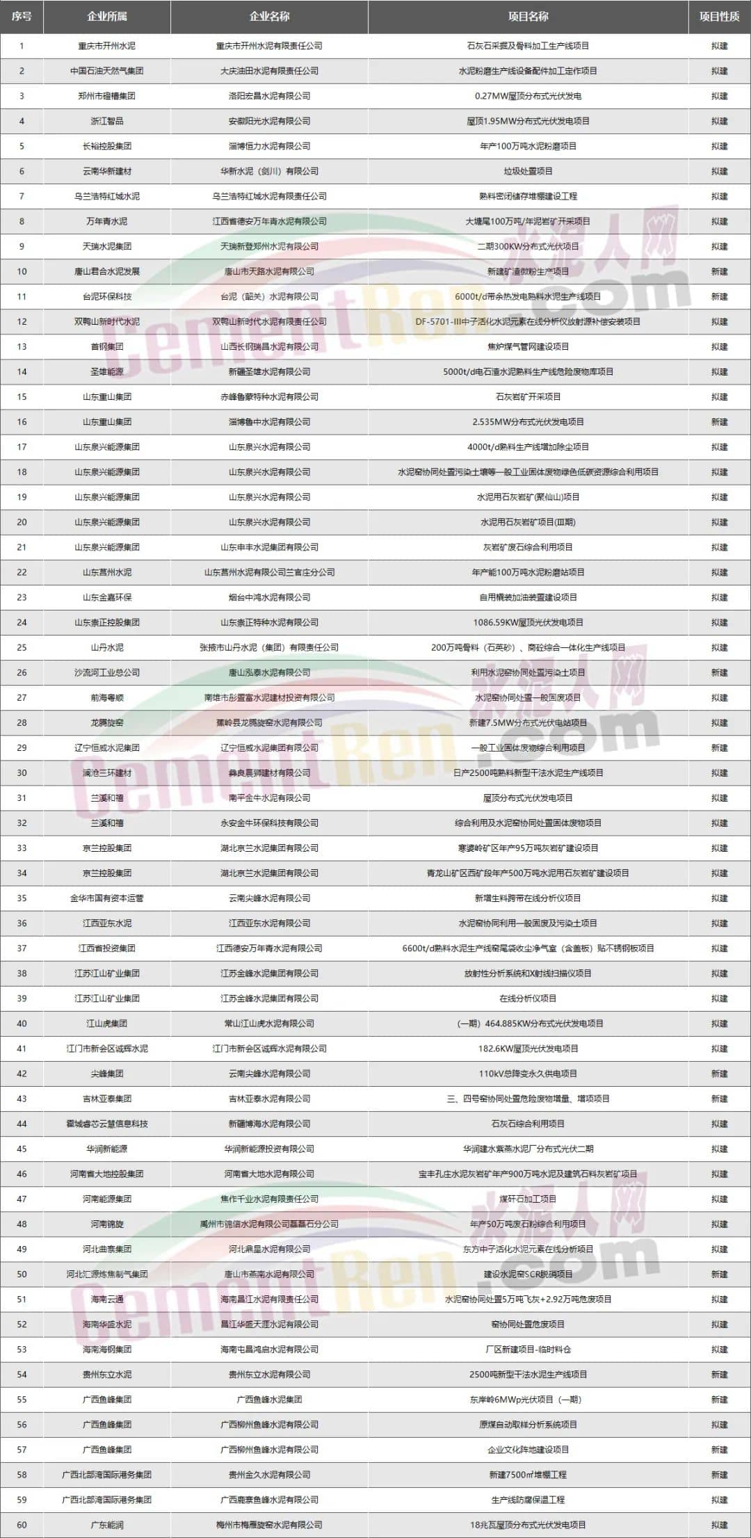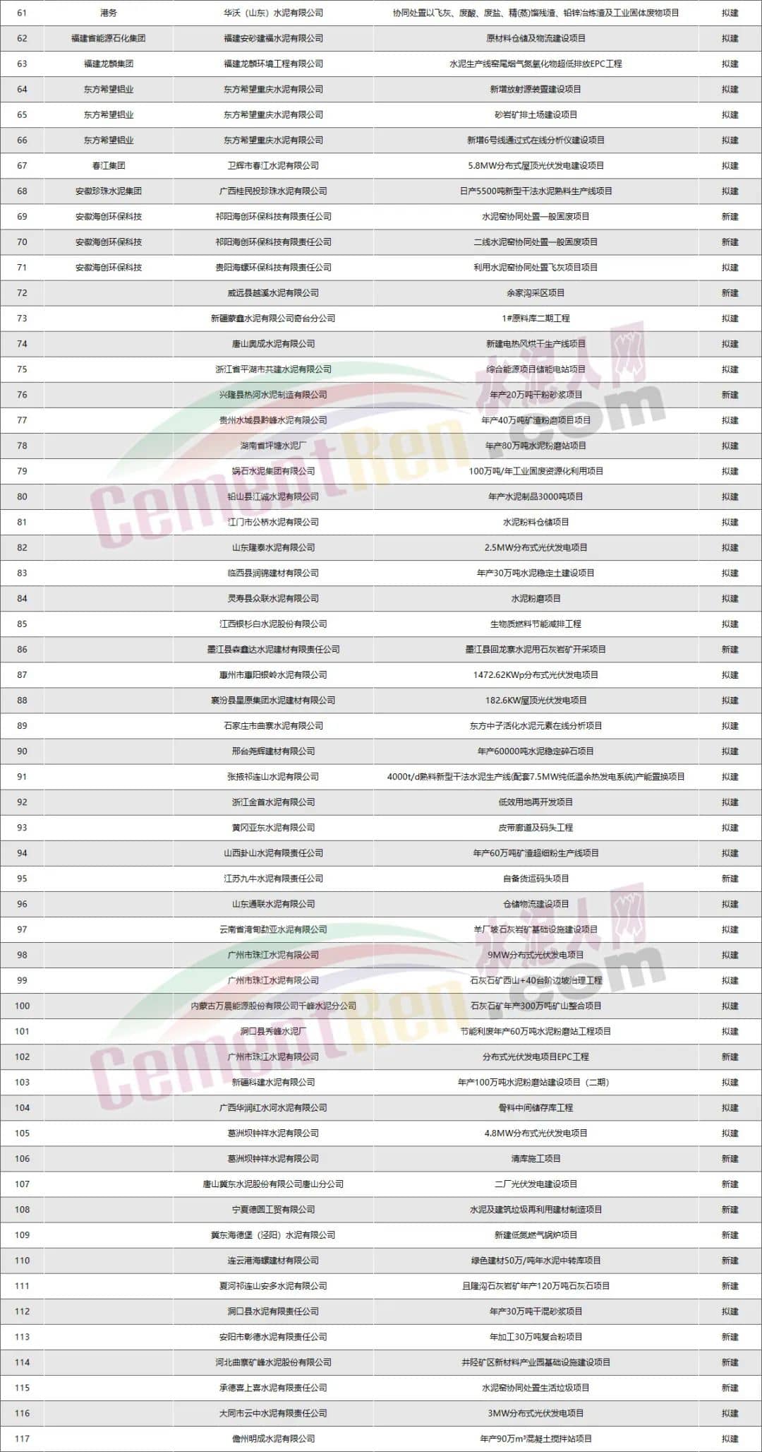 其他水泥企業(yè):新建擬建項目共117個