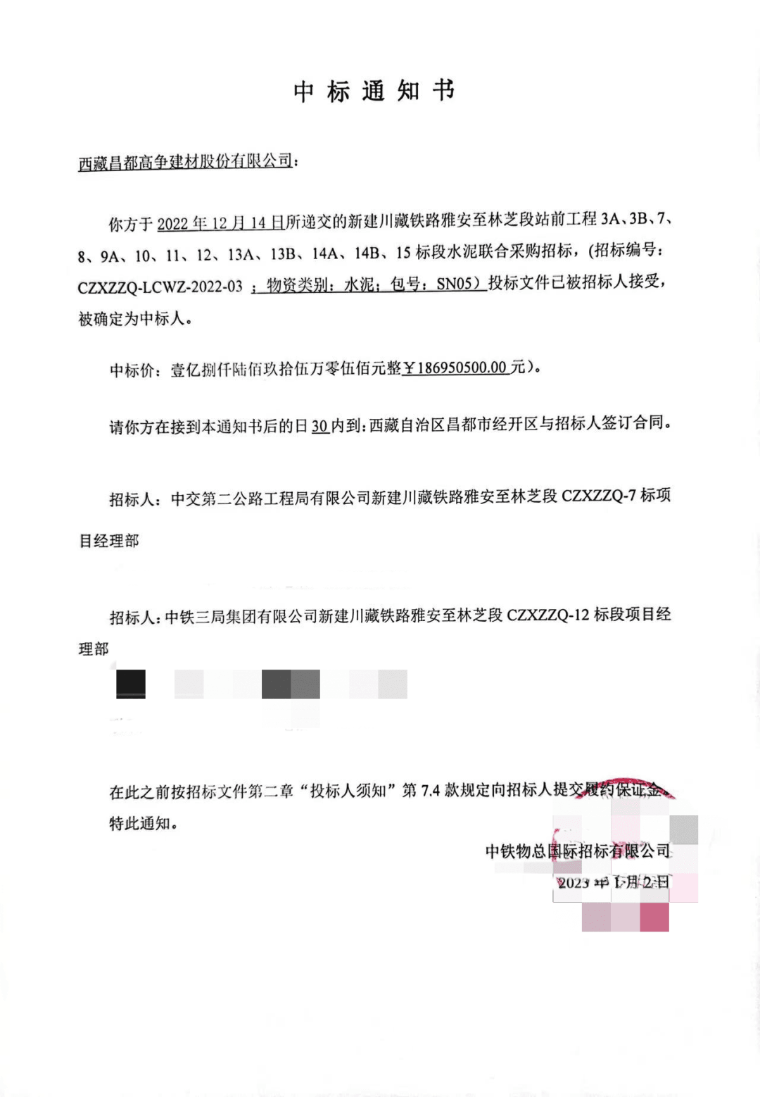 最終,在黨委書記、董事長和領導班子的正確決策、大力支持和各部門的精誠團結(jié)、全力配合之下,昌都高爭憑借扎實的服務態(tài)度和良好的社會信譽在激烈的競爭中脫穎而出,順利中標川藏鐵路雅安至林芝段工程水泥采購項目,成功獲得水泥供應權,中標量28萬噸,中標金額約1.87億元。