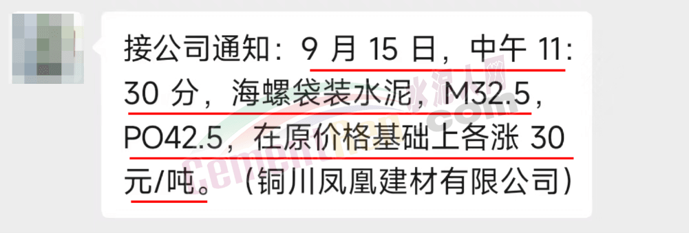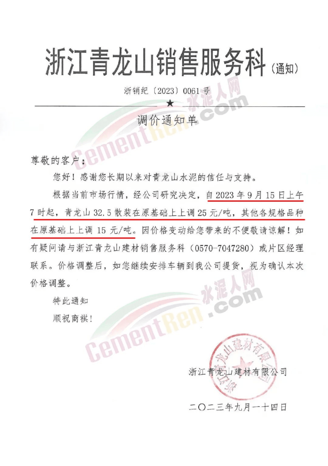 華新金龍水泥(鄖縣)有限公司通知,鑒于當(dāng)前原材料價格上漲,及市場行情變化,公司決定于2023年9月14日起所有品種水泥價格上調(diào)30元/噸。