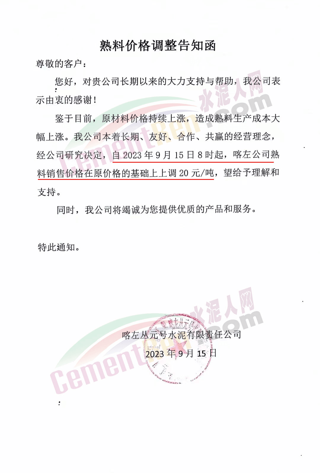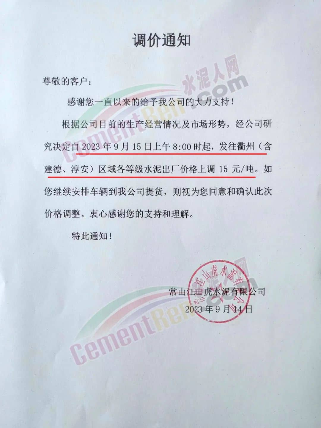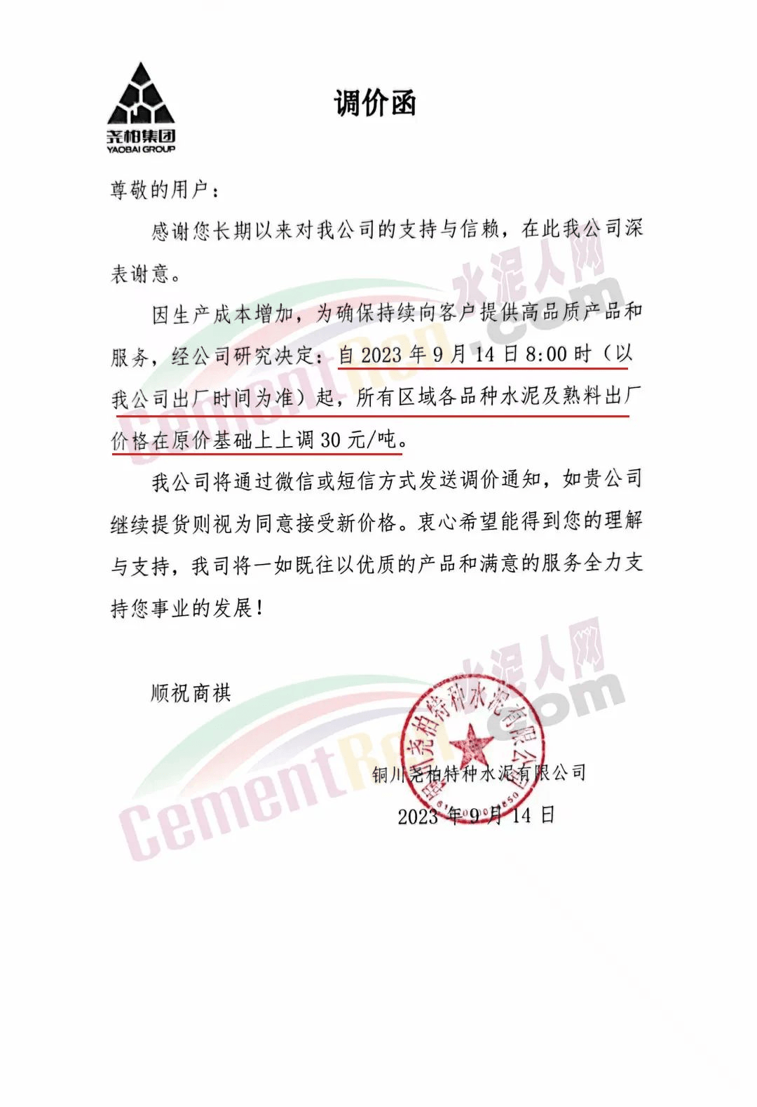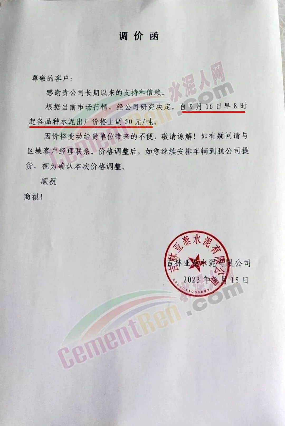 遼寧金隅冀東水泥貿(mào)易有限公司通知,由于生產(chǎn)成本大幅度提高,經(jīng)公司研究決定自2023年9月16日8時起,對銷售至長春地區(qū)、四平地區(qū)及松原地區(qū)的水泥價格在原價格基礎(chǔ)上調(diào)50元/噸。