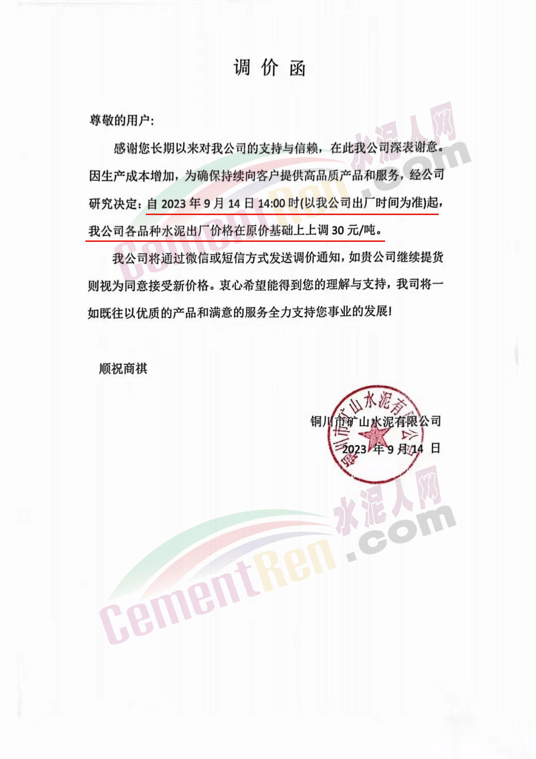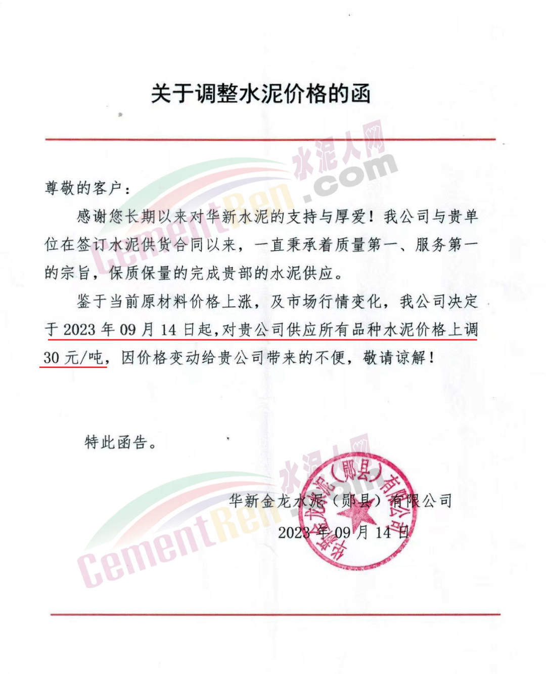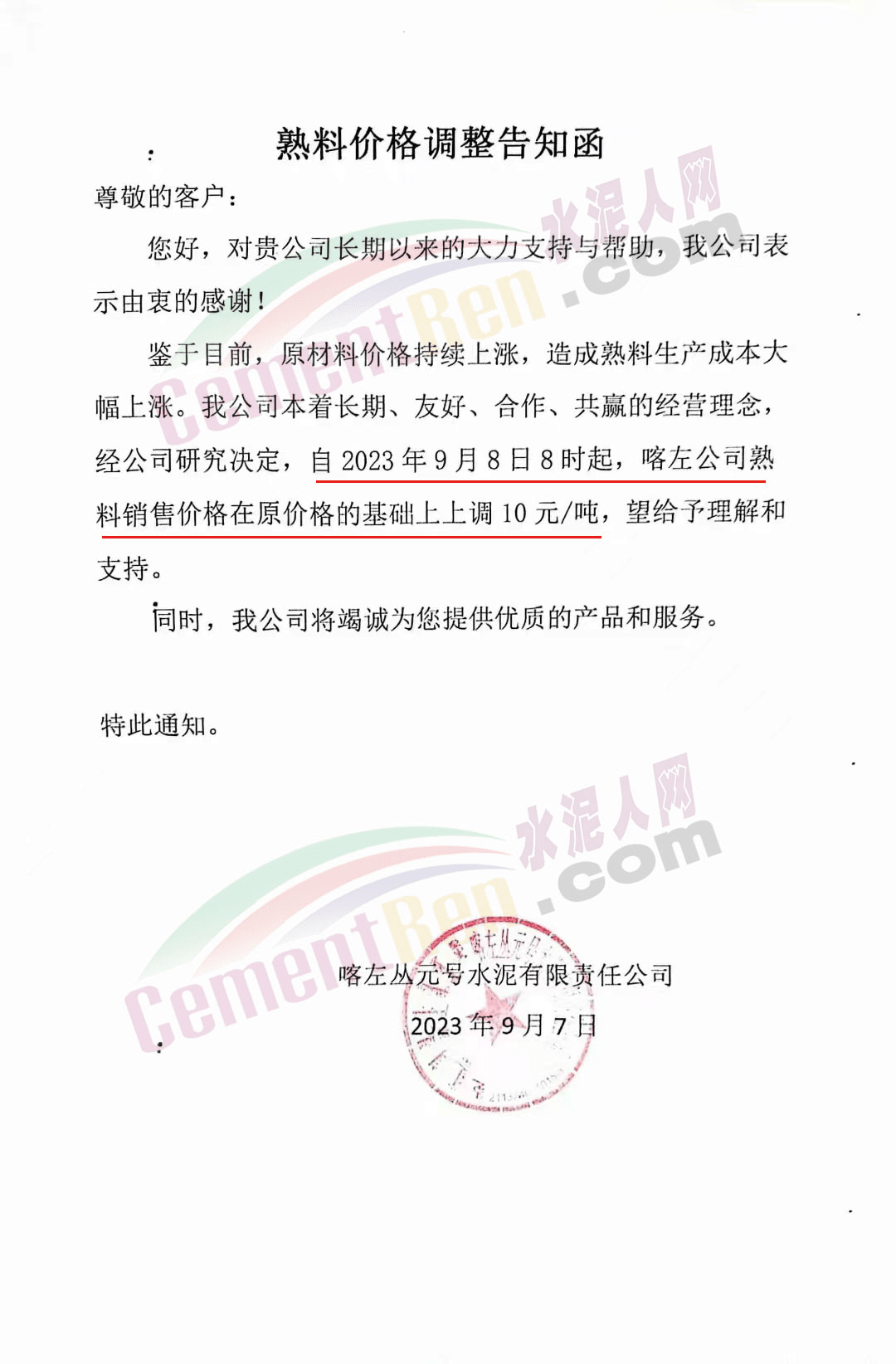 遼寧金隅冀東水泥貿(mào)易有限公司通知,由于生產(chǎn)成本大幅度提高,經(jīng)公司研究決定自2023年9月16日8時起,對銷售至長春地區(qū)、四平地區(qū)及松原地區(qū)的水泥價格在原價格基礎(chǔ)上調(diào)50元/噸。