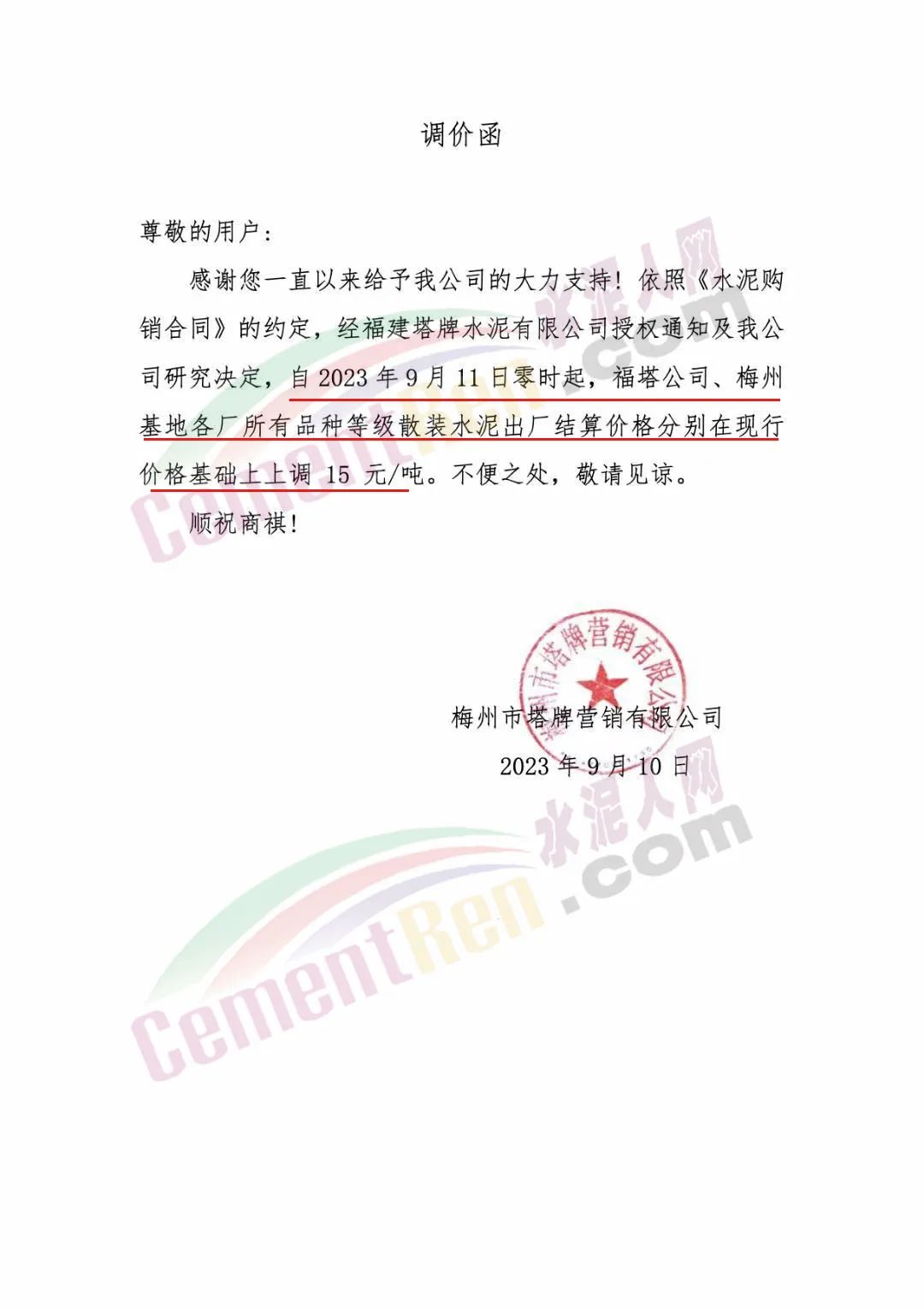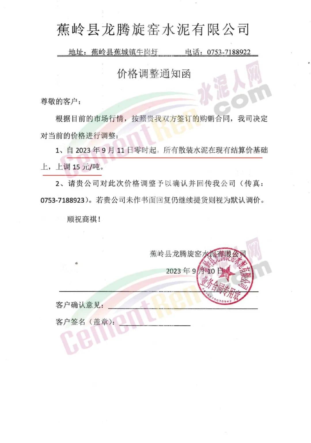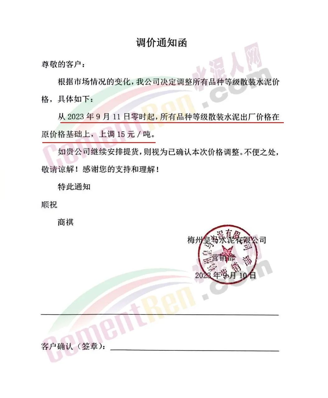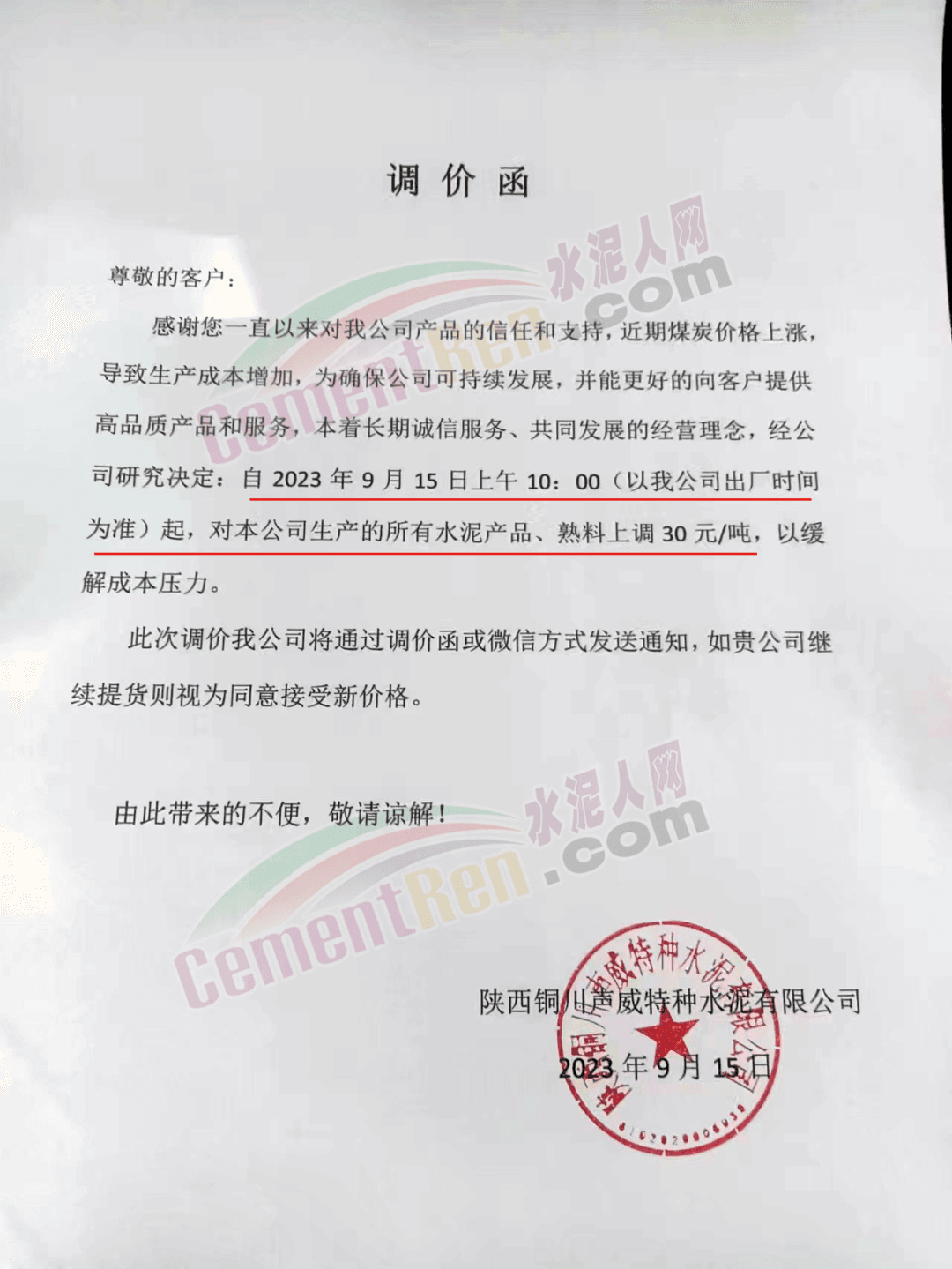 遼寧金隅冀東水泥貿(mào)易有限公司通知,由于生產(chǎn)成本大幅度提高,經(jīng)公司研究決定自2023年9月16日8時起,對銷售至長春地區(qū)、四平地區(qū)及松原地區(qū)的水泥價格在原價格基礎(chǔ)上調(diào)50元/噸。