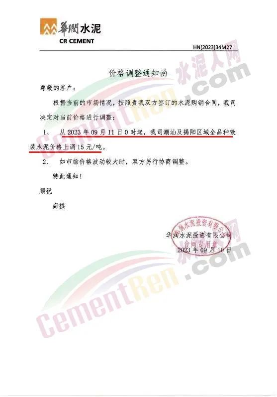9月11日,廣東梅州、揭陽、潮汕多地包括華潤、塔牌等主要品牌在內(nèi)的多家水泥企業(yè)通知水泥價格上調(diào)15元/噸。